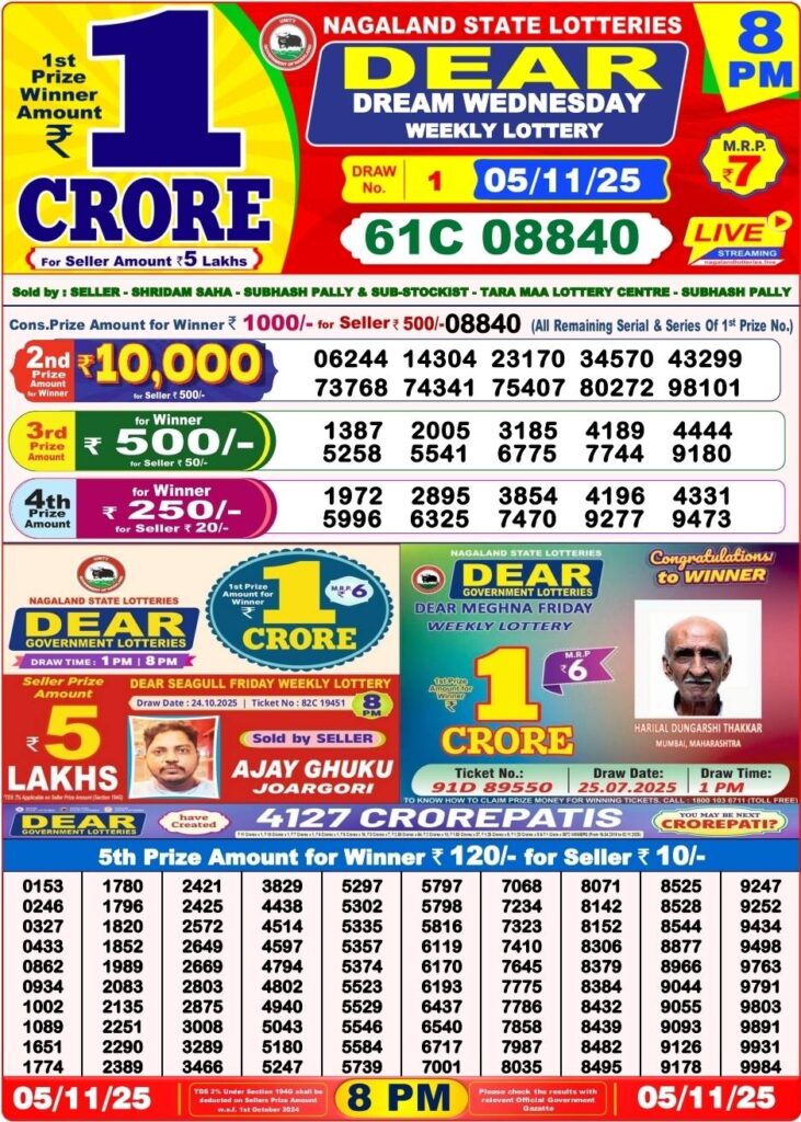 আজকের প্রথম খেলা ১১টা ৫৫ এর সময় নাগাল্যান্ড রাজ্য লটারি থেকে ‘DEAR TEESTA MORNING’, আজকের দিনের লটারি সংবাদের দ্বিতীয় খেলা নাগাল্যান্ড এর ই কোহিমা শহর থেকে বিকাল ৪টার সময় ‘DEAR MOON TUESDAY’, আজকের শেষ খেলা রাত ৮টার সময় নাগাল্যান্ডের ‘DEAR PARROT EVENING’, প্রত্যেক টি খেলার পুরস্কার ই ১ কোটি টাকা।